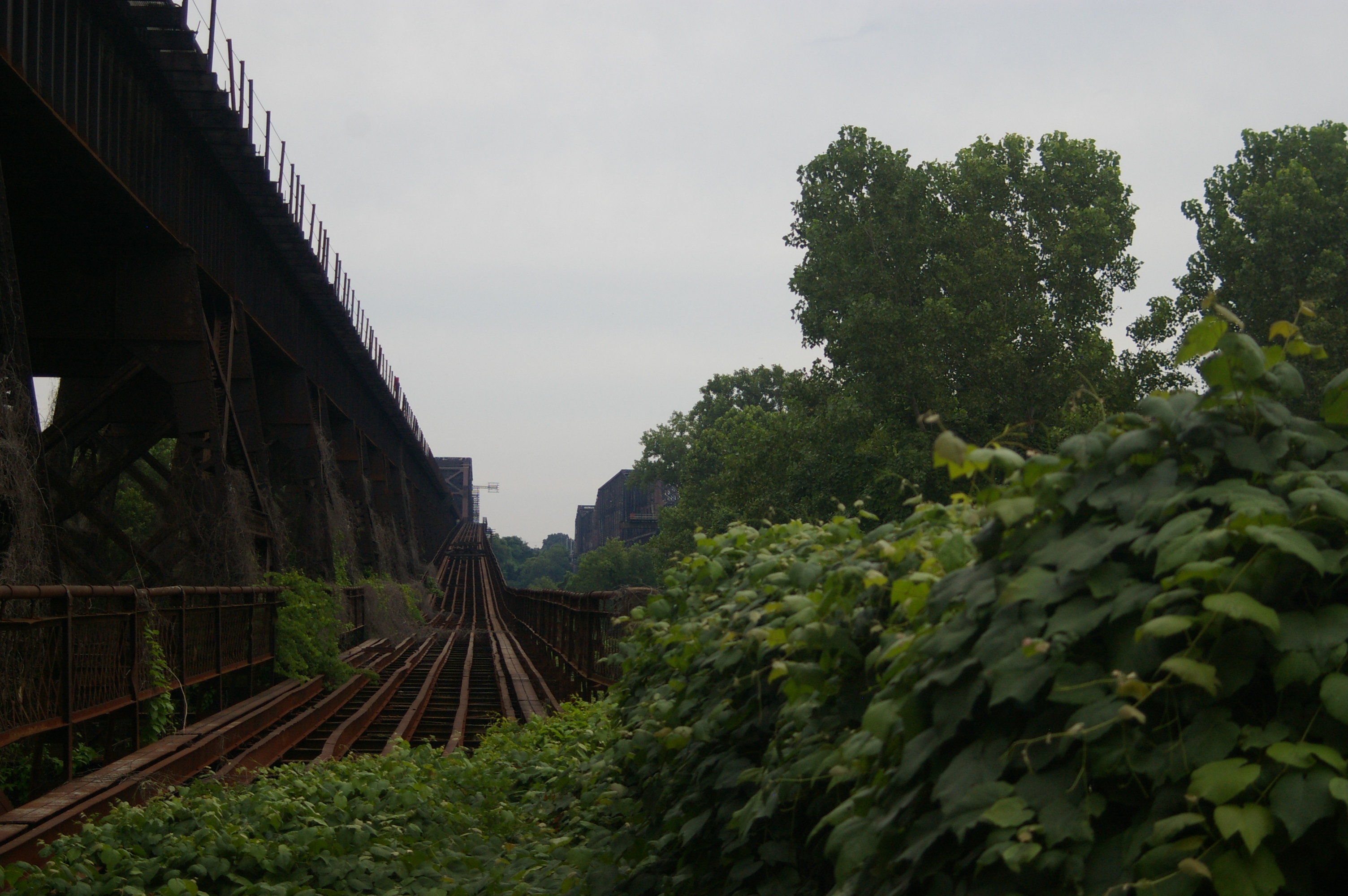 Looking East at the remains of the old East-bound roadway on the Harahan bridge. Clearly, it is no longer usable. The Frisco Bridge can be seen through the weeds to the right.
